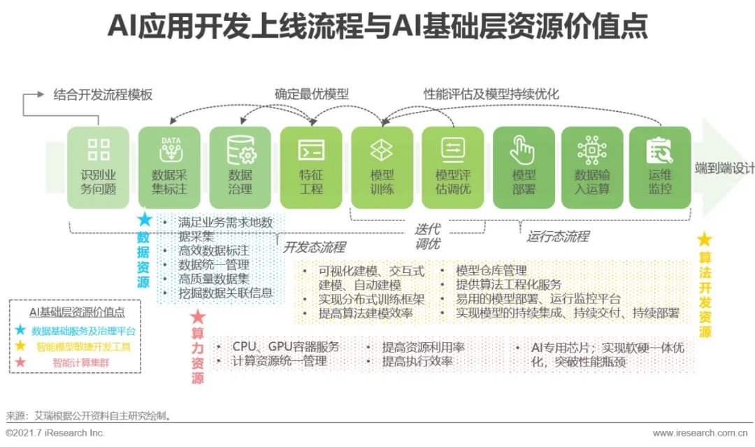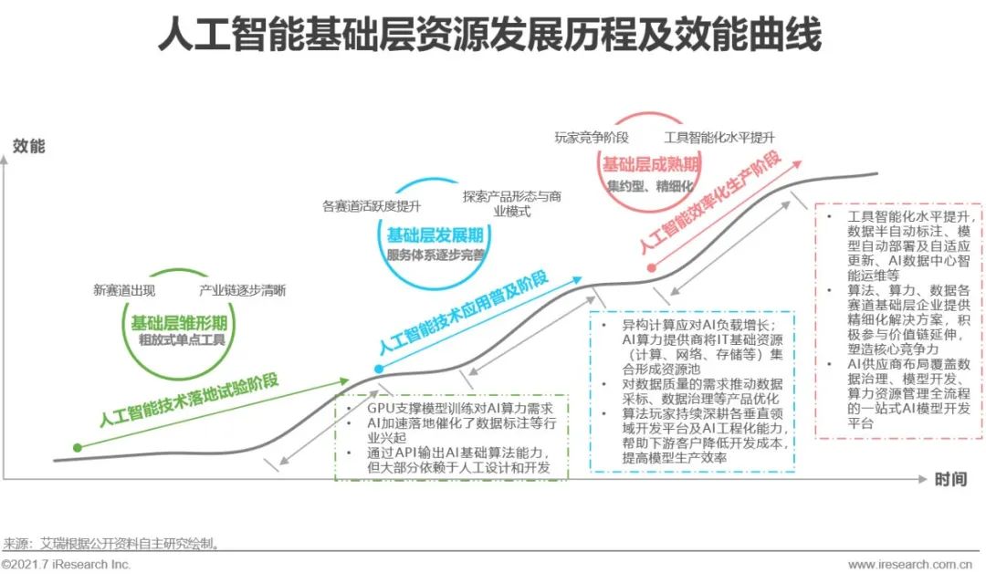 智能化转型趋势下,企业部署AI项目的需求正经历着变化,对数据质量、模型生产周期、模型自学习水平、模型可解释性、云边端多样部署方式、人力成本及资金投入、投资回报率等的要求都逐步走高。在上述需求特点及自动机器学习、AI芯片硬件架构等技术发展的共同推动下,AI基础层资源的整体效能水平也在不断进化,以有效降低需求企业的AI开发成本。大致涵盖相互交融的三个阶段:雏形期,算法/算力/数据各模块多为粗放式的单点工具,新兴产品及赛道逐步出现;快速发展期,各赛道活跃度显著提升,参与者积极探索产品形态与商业模式,基础层服务体系逐步完善、资源价值凸显;最后则向成熟阶段过渡,各赛道内企业竞争加剧,逐步跑出头部企业。同时各赛道间企业生态合作增多,一站式工具平台出现。